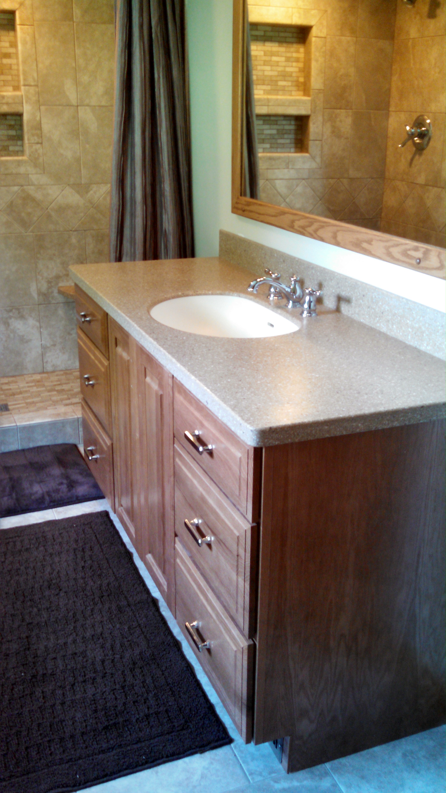 • Bathroom remodelCustom built, laminate covered vanity cabinets, and laminate counter top with painted mirrors.